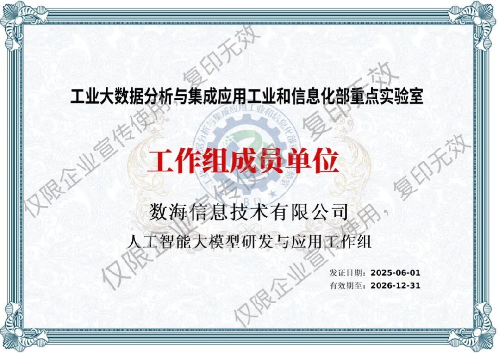 近日,數(shù)海信息集團成功入選“工業(yè)大數(shù)據(jù)分析與集成應用工業(yè)和信息化部重點實驗室”工作組成員單位名單,成為該實驗室下設的“人工智能大模型研發(fā)與應用工作組”重要成員。“工業(yè)大數(shù)據(jù)分析與集成應用工業(yè)和信息化部重點實驗室”是在工信部指導下,由國家工業(yè)信息安全發(fā)展研究中心牽頭組建的全國性工業(yè)大數(shù)據(jù)創(chuàng)新資源集聚與服務平臺。實驗室緊密圍繞區(qū)域、行業(yè)及企業(yè)在數(shù)字化轉(zhuǎn)型過程中的實際需求,聯(lián)合產(chǎn)學研用各方力量,致力于開···